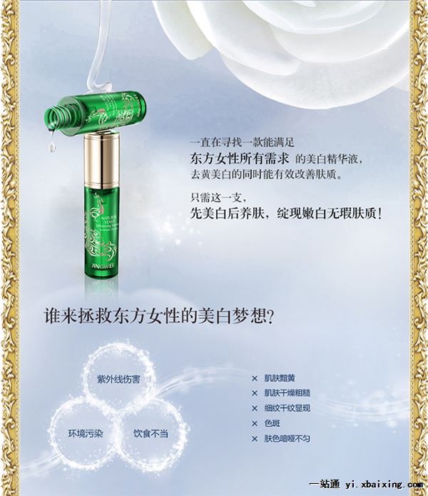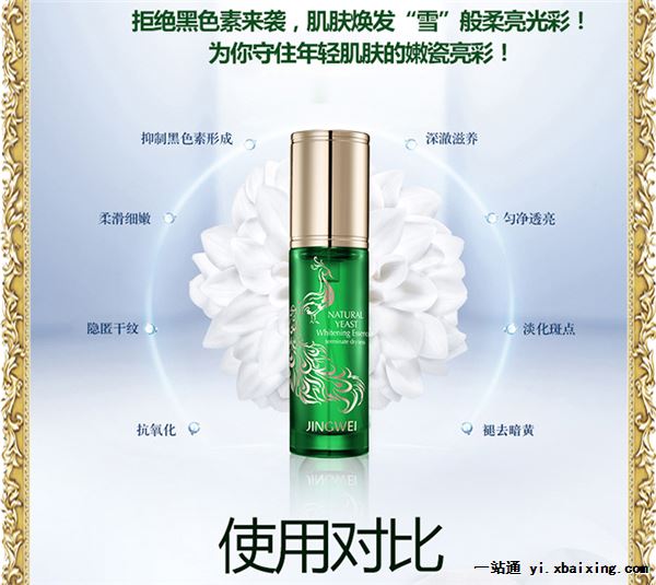 产品名称:京薇酵母精华雪肌精华 产品品牌:京薇 净含量:30ml 产品种类:精华 产品热点:拒绝黑色素来袭,肌肤焕发“雪”般柔亮光彩!为你守住年轻肌肤的嫩瓷亮彩! 产品特点及功效 1、 天然活跃精华:在沁润中促进肌肤自然新生,清除衰老凋亡细胞,塑造肌肤明亮胜雪、年轻水嫩的完美状态。 2、 保湿循环:密集修护肌底干燥受损,修复源源供水保湿循环,令肌肤畅饮水润而恢复天然水油平衡,日臻饱满、弹性。 3、 纯活性酵母原液:多种维他命、氨基酸、矿物质能深入肌肤,追踪截击黑色素,一方面淡化肌肤已有黑色素,另一方面抑制黑色素生成。 4、 天然植物精粹:丝绸般顺滑质地,轻轻一抹即被肌肤愉悦吸收,双重效能迸发无可比拟的美白亮肤生机,肌肤素净、柔嫩可见可触。 主要成分:母菊提取物、光果甘草提取物、虎杖提取物、积雪草提取物、迷迭香叶提取物。 上面展示的价格只是零售价,如果想了解批发价格请点击联系我们查看联系方式进行联系