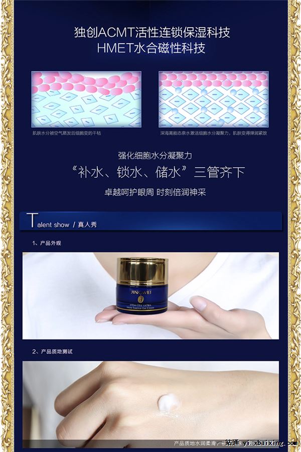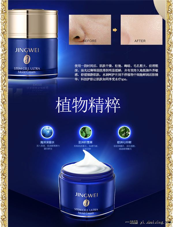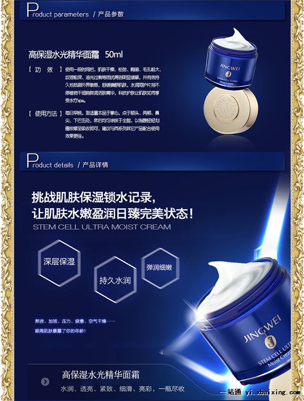 产品名称:京薇高保湿水光精华面霜 产品品牌:京薇 净含量:50ml 产品种类:面霜 产品热点:挑战肌肤保湿锁水记录,让肌肤水嫩盈润日臻完美状态! 产品特点及功效 1、鲜活水润精华:以小分子能量释放,维持皮肤组织中水分含量和电解质代谢,直接沁润至肌肤底层并形成强大的锁水网络。 2、水润呵护:令干燥粗糙、发硬的角质层即刻变得柔软,肌肤沉浸于极润滋养的舒适感受中。 3、鲜润活肤精华:于外遮掩肌肤黄气、痘印、斑点等,于内深彻截击黑色素,令肌肤一点一点地透现白皙、透亮。 4、天然植物干细胞:绵滑霜体融入植物干细胞精粹,能与皮肤的天然水脂膜融合,带来第二层轻透密润的保护! 主要成分:透明质酸钠、糖类同分异构体、氢化甜杏仁油、角鲨烷、维生素E。 |